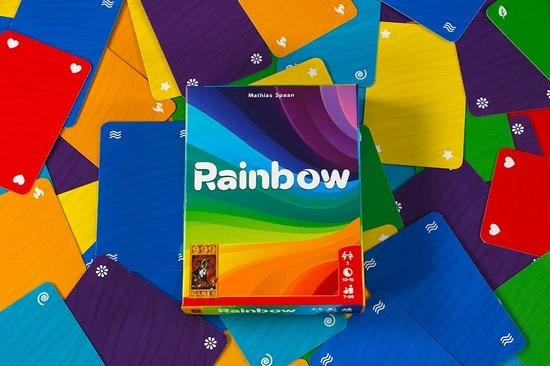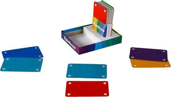 Met Rainbow moet je regenboogsetjes maken van zes verschillende kleuren. Deze maak je door kaarten met kleuren te spelen. Maar je speelt niet alleen met je eigen kaarten. Je speelt ook met de achterkant van de kaarten van de speler tegenover je! De achterkant van de kaarten van de tegenspeler mogen worden gebruikt door deze op tafel om te draaien. Je weet niet wat voor achterkanten je zelf hebt. Draai je per ongeluk een zwarte kaart of een kleurenkaart die dubbel in de rij ligt om, dan moet je direct kaarten aan je tegenspeler geven. Wie de meeste regenbogen verzamelt, wint! Dit is een bedrieglijk simpel kaartspelletje voor twee spelers, dat je wint dankzij wat geluk, een goede strategie en vooral een goed geheugen. Hoe ver durf jij te gaan met het omdraaien van kaarten?