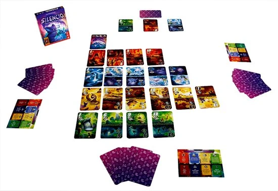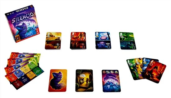 Silencio is een snel kaartspel waarbij je samen zoveel mogelijk reiskaarten moet afleggen. Als team maak je een reis door een wonderlijke wereld vol bossen, moerassen, savanne en lava. Dit doe je door kaarten in dezelfde kleur op elkaar aan te sluiten. Maar pas op: niemand mag geluid maken! Zodra iemand iets zegt, heeft iedereen verloren. Elke reiskaart die je aansluit, moet hoger zijn dan de eerder gespeelde reiskaart. Elke kaart heeft verder een nadelig of een voordelig effect. Een kaart die direct aansluit, zoals een rode vijf na een rode vier, geeft een nadeel. Bij een kaart die niet direct aansluit mag je het voordelige effect gebruiken. Als je geen kaart kunt aanleggen, moet je de beurt overslaan. Als een ronde lang niemand een kaart aan heeft kunnen leggen, is het spel afgelopen. Omdat je niet mag overleggen, moet je goed inschatten wat iedereen doet. Misschien speel je een kaart die iedereen dwarszit? Of voel je je teamleden goed aan en halen jullie een topscore? Hoe minder kaarten je overhoudt, hoe beter!