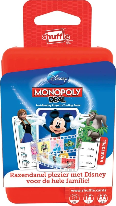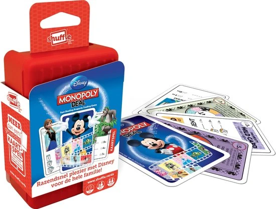 het leuke Monopoly Deal is er nu ook in een leuk Disney thema, bemachtigen eigendommen of stelen van je tegenstanders! Wie als eerste 3 setjes eigendommen bezit wint het spel. Gebruik de verschillende actiekaarten om huur te vragen, kaarten om te ruilen of te stelen van je tegenstanders, en nog veel meer. Zorg dat er genoeg geld in je bank zit en kijk uit, want andere stelen ook van jou! Dit Item betreft de Benelux editie, verzamel provincies en regio?s uit Nederland, Belgi? en Luxemburg , zoals Noord-Holland, Flevoland, West-Vlaanderen, Antwerpen, Luxemburg en treinstations als Amsterdam-Centraal en Brussel Zuid.