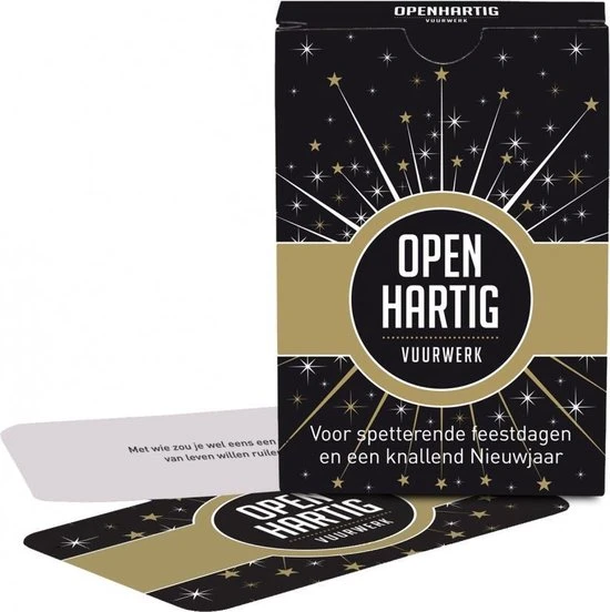 Kleine set Openhartig Vuurwerk vragen, met 52 kaarten. Deze vragen en opdrachten bieden jullie de gelegenheid wensen, ideeën en voornemens met elkaar te delen en zo te zorgen voor fonkelende, spetterende of knallende momenten.