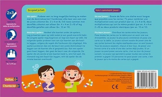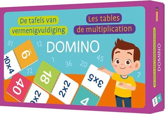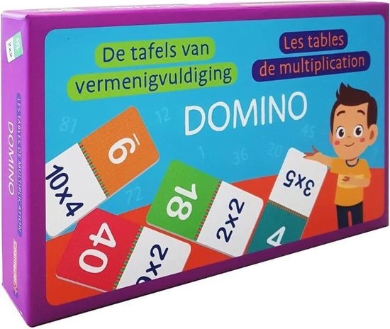 In deze doos zitten een heleboel kleurrijke dominokaarten voor urenlang speel- en oefenplezier! Speel samen met je vrienden of familie en combineer elke keer een som met de juiste uitkomst (bv. 2 x 4 en 8), link twee sommen met dezelfde uitkomst aan elkaar (bv. 4 x 4 en 2 x 8) of leg dezelfde getallen aan elkaar (bv. 12 en 12). Wie is het snelst zijn dominokaarten kwijt en wint het spel? Of speel alleen en maak een zo lang mogelijke dominoslang! Wedden dat je een echte tafelkampioen wordt?