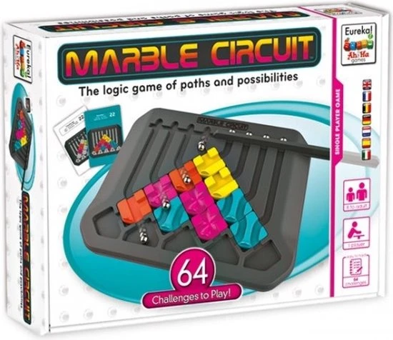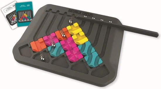 Voorspel de paden van de knikkers en voeg de resterende mysterytegels toe zodat het aantal knikkers dat in de vijf doelvelden verzameld wordt, overeenkomt met de uitdagingkaart.