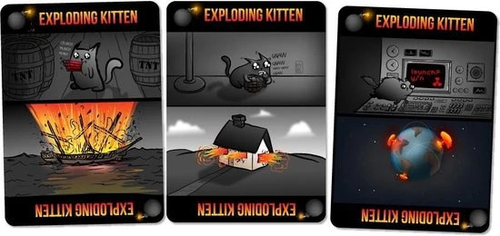 Exploding Kittens is een fantastisch kaartspel voor mensen die van katten, explosies, laserstralen en soms ook van geiten houden. Dit tactische spel is een variant van Russisch roulette, maar dan met exploderende kittens. Je neemt kaarten van de stapel totdat je ??n van de gevreesde exploderende kittens trekt. Dan heb je meteen verloren. Met alle andere kaarten kun je jezelf verdedigen, aanvallen, een beurt overslaan of de katten afleiden. Alle kaarten zijn voorzien van hilarische illustraties van The Oatmeal.