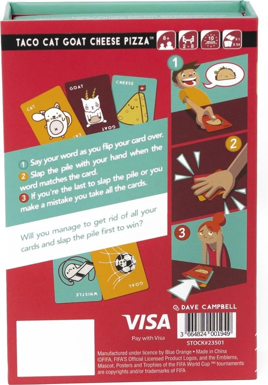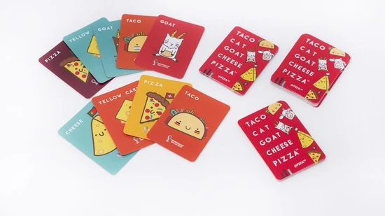 Taco Cat Goat Cheese Pizza ! (Taco Kat Geit Kaas Pizza!) Houd deze 5 gekke woorden in gedachten. Zodra er een match is tussen een kaart en een gesproken woord, moet je het snelst met je hand op de centrale kaartenstapel meppen. De laatste speler moet alle kaarten oprapen. Wees er snel bij om als eerste al je kaarten kwijt te raken. Maar pas op! Je geest kan je voor de gek houden. Dit verslavende spel is net zo uniek als zijn naam. Veel plezier! De internationale handleiding bevat ook uitleg in het Nederlands..