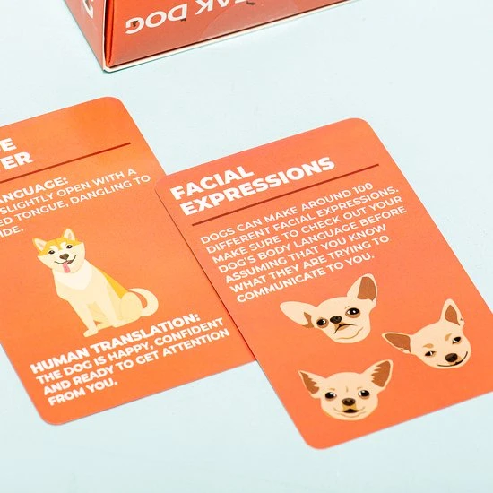 How to speak kaarten van Gift Republic. Kaartenset die uitlegt hoe je de (lichaams)taal van je hond kunt interpreteren. In totaal zitten er 100 kaarten in de set die je alles over je trouwe viervoeter vertellen. De kaartjes zijn ge?llustreerd en hebben Engelse teksten. Leuk om cadeau te geven aan een dierenvriend of iemand die net een puppy heeft gekregen.