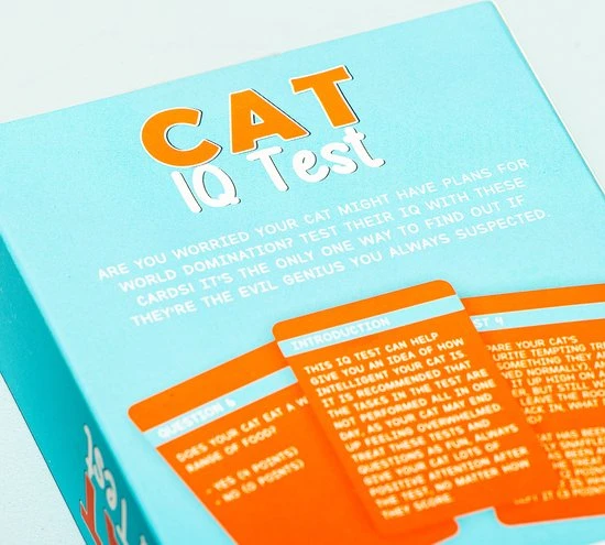Kat IQ test van Gift Republic. Hoe slim is jouw kat? Dat test je met de vragen en opdrachten van de Kat IQ test. Je krijgt bijvoorbeeld de vraag: weet jouw kat het wanneer je zijn eten voorbereid? In totaal zitten er honderd vragen en opdrachten in de verpakking. Let op: de teksten zijn geschreven in Engels.