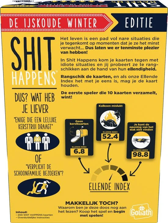 Shit Happens: De Ijskoude Winter Editie! Ja het leven valt niet mee en door ongemakkelijke situaties tijdens het kerstfeest daalt de temperatuur nog verder onder nul.. Shit Happens is een hilarisch en weerzinwekkend, maar levensecht partyspel. Je komt allerlei ongewenste situaties tegen die je moet rangschikken op je ‘lane of pain’ die loopt van 1 tot 100.