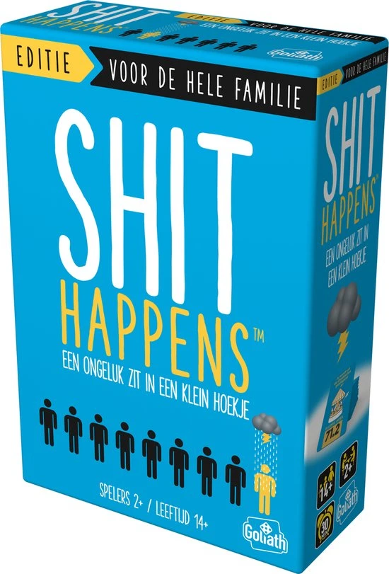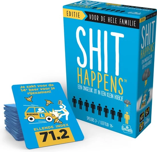 Na de populaire Shit Happens 18+ editie hebben we nu ook een variant die geschikt is voor het gezin (14+). De Shit Happens Familie Editie is een leuk en brutaal gezelschapsspel waarin je de ergste situaties ooit tegenkomt. Het is aan de spelers om ze correct te rankschikken op de Shit’O’Meterschaal van 1 tot 100.