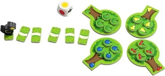 - Inhoud: 4 bomen, 4 groene appels, 4 rode kersen, 4 gele peren, 4 blauwe pruimen, 8 padplaatjes, 1 raaf Theo, 1 dobbelsteen met kleuren en symbolen, 1 speeldoos, 1 handleiding in Nederlands, Duits, Frans, Italiaans, Spaans en Engels.