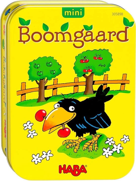 Co?peratief spel Boomgaard mini is de mini versie van de wereldwijd populaire Haba klassieker. Ideaal voor onderweg. In de boomgaard hangen de sappigste kersen, appels, pruimen en peren. Maar iemand wil ze stelen: raaf Theo is in aantocht! Nu hebben de spelers wat geluk met de dobbelstenen nodig. Samen proberen ze het fruit te oogsten voordat de gulzige raaf de boomgaard bereikt.