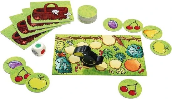 Een cooperatief geheugenspel. Alarm! De brutale raaf staat op het punt jullie lekkernijen weg te kapen. Verzamel al het fruit door de bij de gegooide kleur passende vruchten om te draaien. Het doel van het spel is om al het fruit te verzamelen voordat de raaf alles van jullie wegkaapt. Vanaf ca. 3 – 99 jaar 1 – 4 spelers Spelduur ca. 10 – 15 minuten