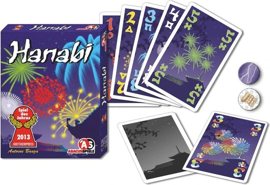 Hanabi is een coöperatief deductie-kaartspel waarbij je wel de kaarten van de tegenstander ziet, maar niet die van jezelf. Je mag elkaar maar een beperkt aantal hints geven met als doel samen elke soort op volgorde af te leggen. Klinkt simpel, maar dat is het zeker niet! Hanabi is genomineerd spel van het jaar 2013 in Duitsland.