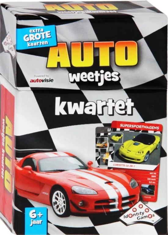 Kwartetten, een oer-Hollands kaartspel waarin steeds 4 kaarten bij elkaar gespaard worden. Kwartet! Nu over auto’s, afgebeeld op extra grote kaarten. Op deze kaarten staan foto’s en ook nog eens interessante weetjes! Inclusief een superkwartet van 5 kaarten.