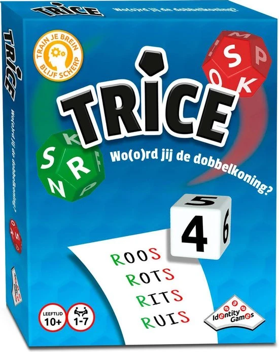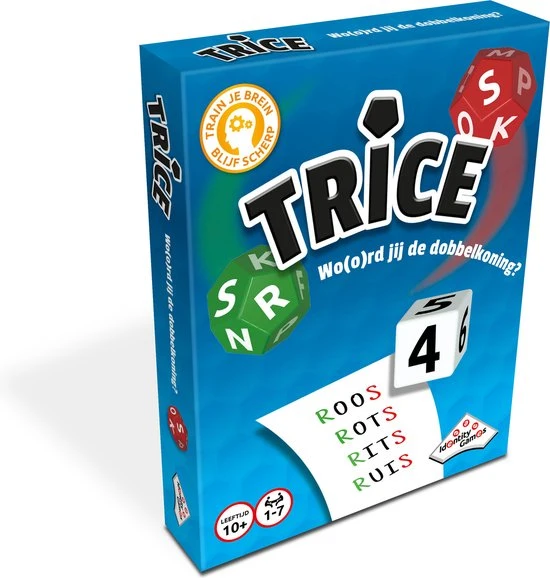 Wo(o)rd jij de dobbelkoning? Met Trice kun je spelen en tegelijkertijd je hersens trainen! Gooi een groene (beginletter), rode (eindletter) en witte dobbelsteen (aantal letters). Schrijf binnen ??n minuut zoveel mogelijk woorden op met de beginletter, eindletter en het aantal letters dat je hebt gegooid. Elk woord is 1 punt. Wie na zes rondes de meeste punten heeft, is de winnaar!