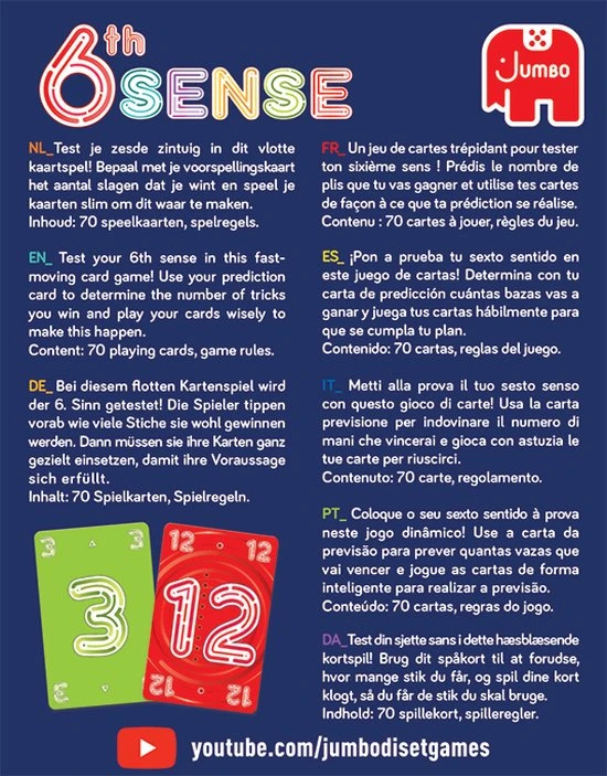Test je zesde zintuig in dit vlotte kaartspel van Jumbo! Bij 6th Sense bepaal je met je voorspellingskaart het aantal slagen dat je zult winnen. Speel je kaarten slim om jouw voorspelling uit te laten komen!