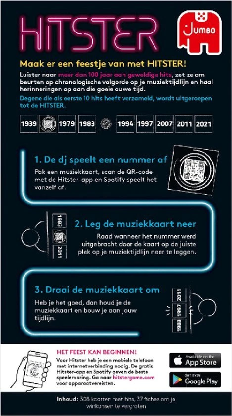 LET OP: Download de gratis Hitster-app om de muziekkaarten te scannen, de muziek wordt automatisch afgespeeld in Spotify (compatibel met de gratis & premium versie). Om Hitster te spelen is een smartphone met internetverbinding nodig.