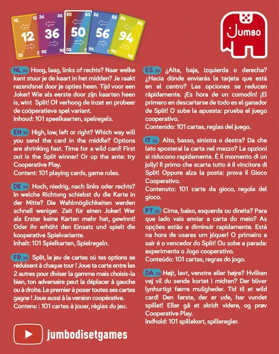 Hoog, laag, links of rechts? Naar welke kant stuur je de kaart in het midden? Je raakt razendsnel door je opties heen. Tijd voor een Joker! Wie als eerste door zijn kaarten heen is, wint Split! Of verhoog de inzet en probeer de coöperatieve spel variant.