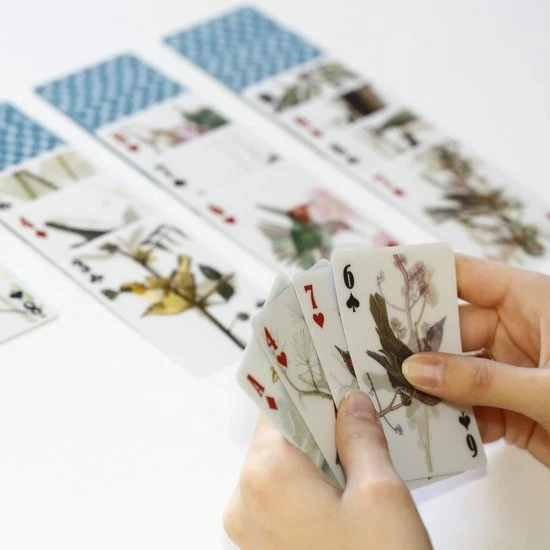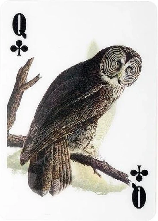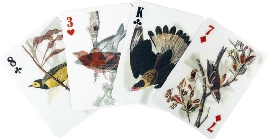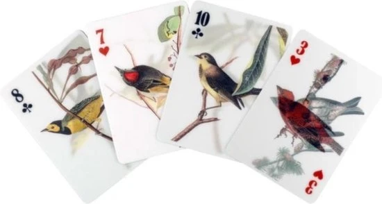 3D speelkaarten van Kikkerland. Een kaartenset met vogels erop afgebeeld. 3D speelkaarten waarbij de vogels bij bewegen lijken te bewegen. Set bestaat uit 52 kaarten met handgetekende vogels en twee jokers. Geschikt voor alle kaartspellen, waaronder pokeren door het speciale pokerformaat van de kaarten. Leuk cadeautje voor vogelliefhebbers.