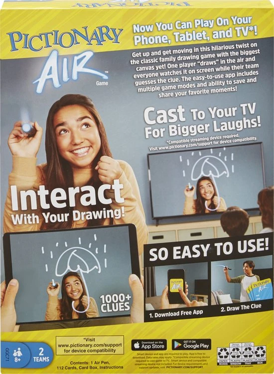 Ontdek Pictionary Air?, een doldwaze manier om het klassieke gezelschapsspel te spelen! Teken in de lucht en je ziet de tekening op je scherm. Zo heb je dit tekenspel nog nooit gespeeld. Download de Pictionary Air app op je smartphone of tablet en je kunt spelen. Richt de camera in de app op de speler die tekent en je ziet die speler m?t zijn of haar tekening op het scherm van je smart apparaat. Het wordt nog leuker als je je tekeningen vanaf je smart apparaat via Apple TV, Chromecast of een ander streamingapparaat naar je tv stuurt. Je hebt dan wel een geschikt streamingapparaat nodig. Kijk op de ondersteuningspagina van Pictionary Air (www.pictionary.com/support) welke apparaten je kunt gebruiken.