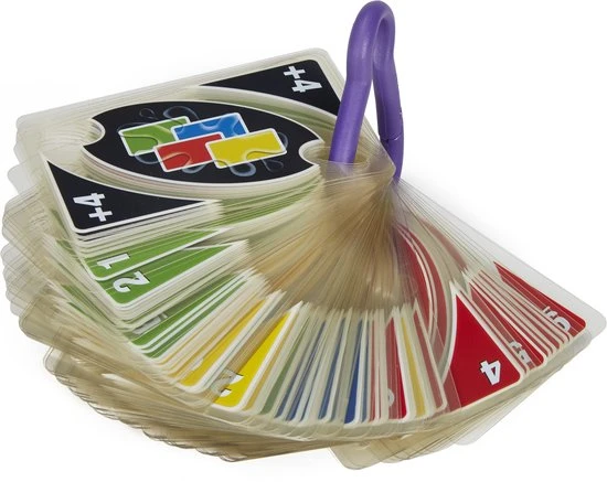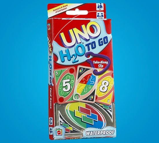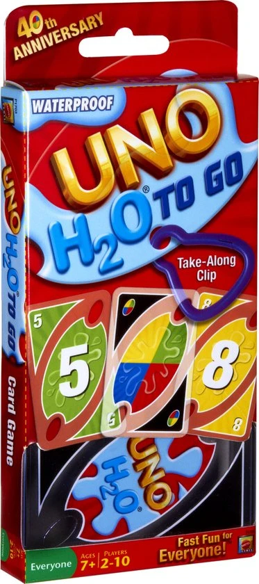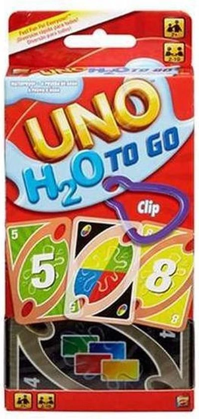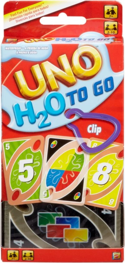 Neem deze stoere versie van UNO overal mee naartoe! De duurzame plastic kaarten zijn waterbestendig dus nu is er overal supersnel speelplezier voor iedereen, zelfs buiten! UNO H2O To Go heeft een handige clip die alle kaarten bij elkaar houdt en die aan een strandtas, rugzak of kampeeruitrusting kan worden bevestigd. Nu kun je UNO® spelen waar en wanneer je maar wilt! Speel het klassieke UNO-spel. Met allerlei opties voor nog meer speelmogelijkheden. Inhoud: 108 UNO H2O To Go kaarten. 7 jaar en ouder.