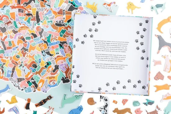 Ben jij in staat om alle 299 honden op de juiste manier in elkaar te passen? De stukjes van deze leuke en bijzondere puzzel hebben geen gewone vorm: elk stukje heeft de vorm van een hond. En het zijn er 299 in totaal! Plus een kat. Kun je die vinden?