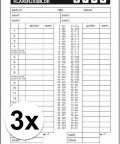 3x Klaverjassen scoreblok A5. Klaverjas scoreblokken met 50 vellen. Het formaat per blokje is ongeveer 14,8 x 21 cm. U ontvangt in totaal 3 scoreblokken. Let op: dit is geen speelgoed en niet geschikt voor kinderen.