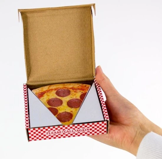Een spel gadgets speelkaarten in de vorm en met aan de achterkant een print van pizzapunten. Afmeting kaart: ca. 10 cm. Verpakt in een mini pizzadoosje. Materiaal: karton. De kaarten zijn Engels talig: Jack, Queen, King. Let op: dit is geen speelgoed en niet geschikt voor kinderen.