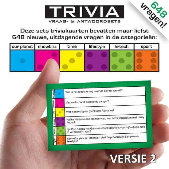 Op zoek naar quizvragen die bij elk bordspel zijn te spelen? Deze universele aanvulset Trivia kaarten is bij elk quizbordspel te spelen en bevat maarliefst 648 gloednieuwe vragen. De quizvragen bevinden zich in de categorieën: Geografie, Entertainment, Cultuur, Historie, Wetenschap en Sport.
