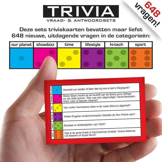 Op zoek naar quizvragen die bij elk bordspel zijn te spelen? Deze universele aanvulset Trivia kaarten is bij elk quizbordspel te spelen en bevat maar liefst 648 gloednieuwe vragen. De quizvragen bevinden zich in de categorie?n: Geografie, Entertainment, Cultuur, Historie, Wetenschap en Sport.