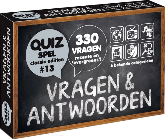 Vragen & Antwoorden – Classic Edition #13 (nieuwe Nederlandse vragen 2021 !) is een pocketformaat (brievenbuspost!) quiz spel (voor 2-6 spelers vanaf 12 jaar) dat zowel als aanvulset / uitbreiding bij andere trivia spellen maar ook als quiz spel op zich gebruikt kan worden. Het spel bevat 55 kaartjes met totaal 330 vragen… z??r recent afgewisseld met ‘evergreens’! De vragen (gemaakt door Marian van Eupen; d? quizvragenmaker van Nederland!) komen uit de 6 bekende categorie?n, gemakkelijk herkenbaar aan de icoontjes. Vragen & Antwoorden… h?t quizspel van dit moment! Niet in de laatste plaats omdat ze makkelijk tijdens videobellen gespeeld kunnen worden! Deze weetjes zijn ook ideaal voor je eigen pubquiz. Het past in iedere broekzak en je kunt het spelen waar jij maar wilt. Er bestaan inmiddels alweer 14 edities! Het trivia spel heeft geen ingewikkeld spelmechanisme. Je gaat gewoon lekker elkaars kennis testen.