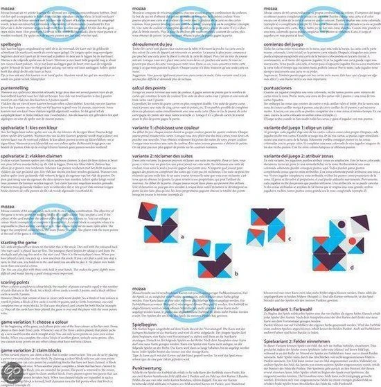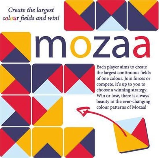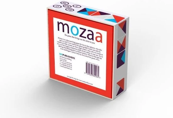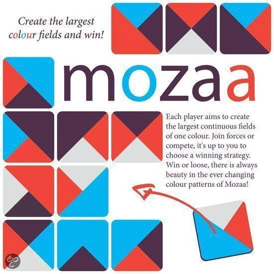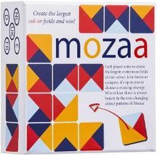 Mozaa can be described as a colourful combination between domino and mosaic. It is the edge matching game that brings out the artist in you The box contains 64 cards (tiles) which all have a unique colour combination. Take a playing card from the stack and place it next to the cards on the table, in such a way that the colours on the edges match. The one who creates the most and largest colour fields wins the game. You can built your own colour fields or block the expansions of other players fields. Whatever strategy you choose, and whether you win or lose, the end result will always be a different and beautiful mosaic.