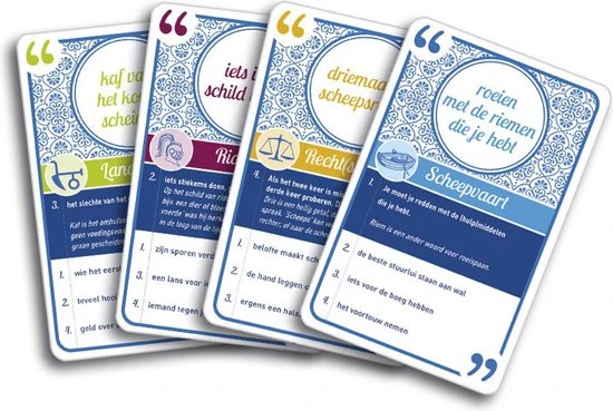 Weet jij waar de letterlijke betekenis van een spreekwoord vandaan komt? In welke situaties gebruik jij ze? Veel spreekwoorden voeren terug naar het gebruik van lang geleden. Met dit leuke kwartetspel leer je op een speelse manier de betekenis en hierkomst van 80 spreekwoorden en uitdrukkingen. Zo steek je meteen oook wat op over de Nederlandse geschiedenis. Totaal 82 kaarten inclusief spelregels! Geschikt voor 2-4 spelers.Voor iedereen vanaf circa 9 jaar!