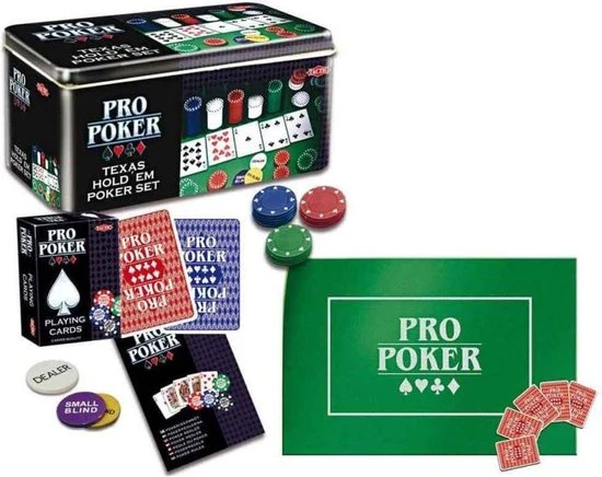 | Verpakkingsinhoud | 1, Pokerkleed, 200, Pokerchips, 1, Dealer, button, 1, Big, blind, button, 1, Small, blind, button, 2, Sets, speelkaarten, 1, Chiprekje, Handleiding |