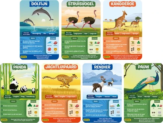 Stel tot 10 vragen om het dier op de speelkaart te raden. Is het een carnivoor? Is het een huisdier? Leeft het dier in een groep? Denk goed na, stel slimme vragen. Gebruik je hintkaarten goed en word de eerste speler die 7 speelkaarten wint!