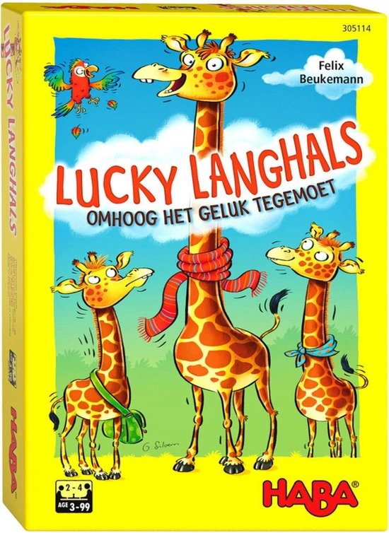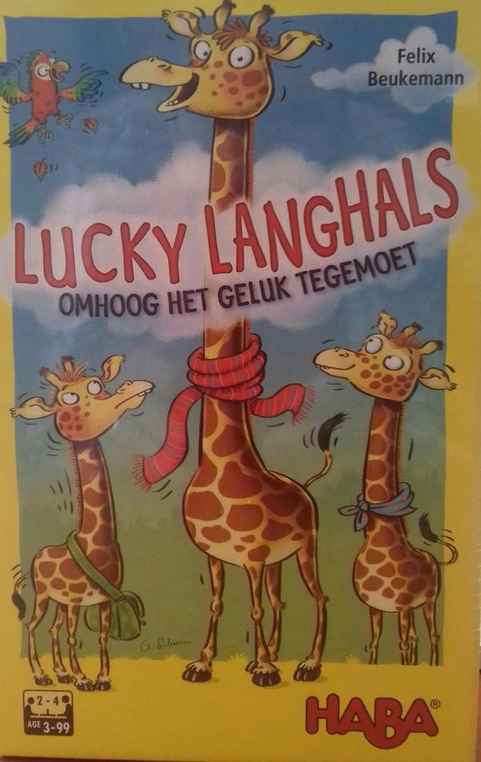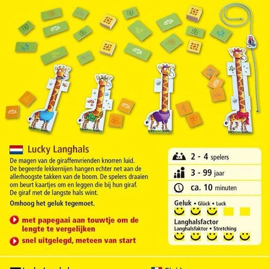 Met spel Lucky langhals ga je omhoog, het gelukt tegemoet! Een plezierig legspel, snel uitgelegd om meteen van start te gaan. De magen van de giraffenvrienden knorren luid. De begeerde lekkernijen hangen echter net aan de allerhoogste takken van de boom. De spelers draaien om beurt kaartjes om en leggen die bij hun giraf. Met de papegaai aan het touwtje vergelijk je de lengte. De giraf met de langste hals wint.