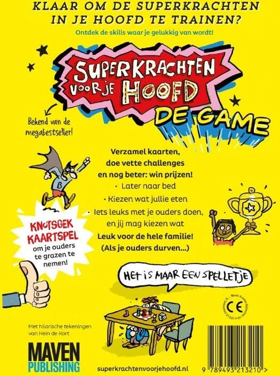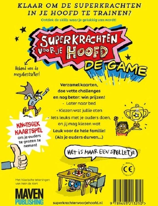Met Superkrachten voor je hoofd: De game ga je aan de slag met de gebruiksaanwijzing van je hoofd en train je de skills waar je gelukkig van wordt. Leer beter omgaan met schaamte, hoe je vriendelijkheid als superkracht inzet, en wat het verschil is tussen saboterende en helpende gedachten. Verzamel alle superkrachten, doe vette challenges en nog beter: win prijzen! Zoals later naar bed, kiezen wat jullie eten of iets leuks doen wat jij bedenkt. En elke kaart is voorzien van een geestige tekening van Hein de Kort. Leuk voor de hele familie (als jullie durven)!
