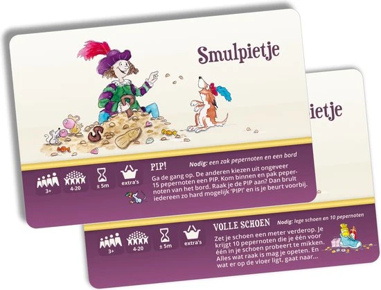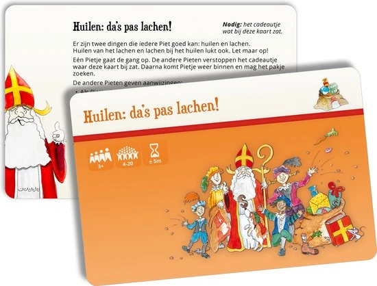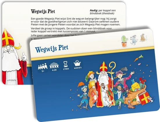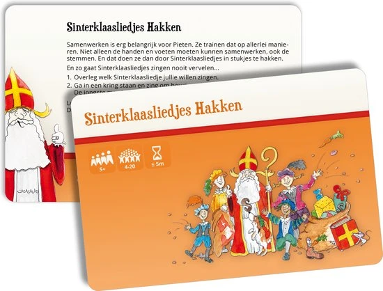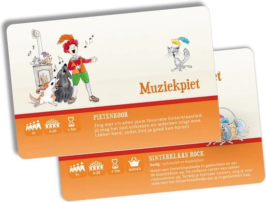 Met de 52 spelkaarten uit het Sinterklaas Surprisespel zijn die niet nodig! Vervang surprises en gedichten door de gekke, lieve, maffe surprisespellen: race tegen elkaar in de snoepgoed estafette, red elkaar van de piraten, maak samen een levende Pietenknoop, gooi met balletjes van oranje, was alle vieze Pietjes, ga Sinterklaasliedjes hakken, doe de Pietenbrul of een van de vele andere spelletjes.