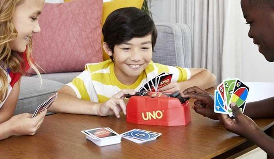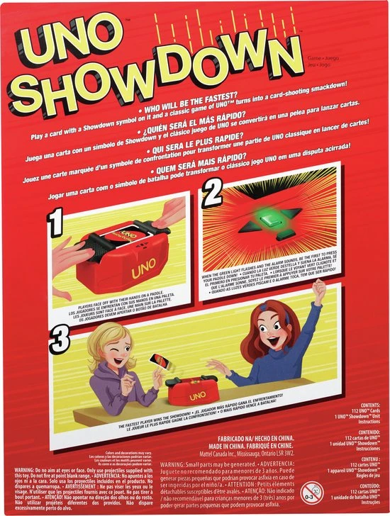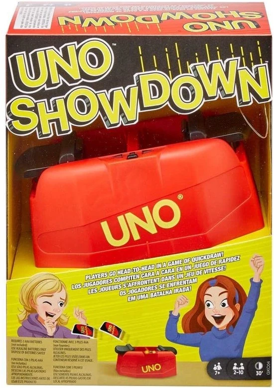 UNO Showdown is een kaartspel dat iedereen leuk vindt, maar met de onverwachte spanning van een plotselinge kaartenregen! Wanneer het lichtje aangaat en het signaal van de UNO Showdown unit afgaat, moet je zo snel mogelijk het pedaal omlaag duwen. De snelste speler wint de ‘showdown’ en laat kaarten uit de UNO Showdown naar de andere spelers vliegen!