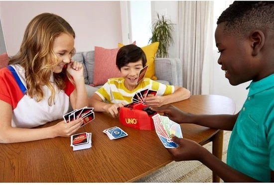 De spelers proberen zo snel mogelijk al hun kaarten uit te spelen door een bijpassende kaart in hun hand op de bovenste kaart van de stapel te leggen. En vergeet niet UNO te roepen als je nog één kaart over hebt! Leuk voor een spelletjesavond met kinderen, volwassenen of het hele gezin en een geweldig cadeau voor spelers vanaf 7 jaar.