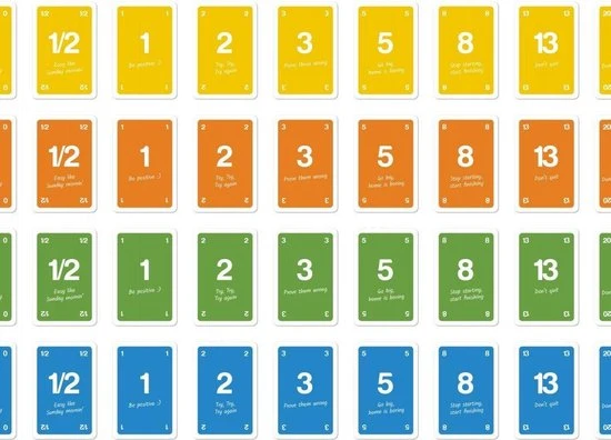 Elk doosje bevat 55 speelkaarten te onderscheiden in 4 reeksen met ieder een eigen kleur. Hierdoor kunnen er per spel maximaal 4 teamleden meedoen. De waarden die op de kaarten staan zijn:0, ½, 1, 2, 3, 5, 8, 13, 20, 40 & 100. Ook zit er standaard een uitleg kaart bij de set, een koffiekaart en een kaart met een vraagteken. Wilt u meer weten over de spelregels van Scrum Planning Poker? Op www.scrumproducten.nl leggen we u in 6 stappen uit hoe Scrum Planning Poker werkt.