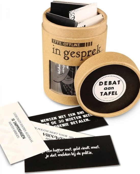 Opzoek naar een leuk discussie spel en ben je gek op debatteren? Dan is deze kletspot ideaal! Het is net even anders dan de andere versier’s die je gewend bent. Het is namelijk de bedoeling dat je gaat discussi?ren en je meningen deelt over de meest uiteenlopende en diepgaande onderwerpen. Soms bloedserieus en soms met een grappige ondertoon. In de pot zitten 200 kletskaarten; 100 voor kinderen (tot 14 jaar) en 100 voor volwassenen. Het is leuk om de kletspot op tafel te zetten zodat je het kan gebruiken bij de thee of met een glaasje wijn erbij. Dus leg je telefoon lekker even weg en pak gezellig de kletspot erbij. Het is een super leuk idee om cadeau te geven. Vind je deze versie niet leuk? Geen zorgen, we hebben nog een aantal beschikbaar.