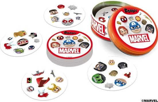 De nieuwe versie van Dobble combineert verschillende wonderlijke stripfiguren met ??n van de meest iconische familiespelletjes. Spelers proberen het symbool te vinden dat overeenkomt met twee kaarten in een snelle, speelse strijd van obsessie, met een aantal van de meest iconische superhelden: Ironman, Captain America, Hulk, …